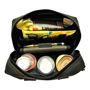 Just to be clear, this isn't a packed kit. It's a pouch with several organizational pockets that you can decide what you want to put in there for whatever your needs are. Meaning - you can build out your kit any way you like.If you want to make a universal family first aid kit to cover most common related injuries, no problem. If you want to make a kid kit just for the little ones with extra GI JOE and GI JANE band aids, no problem. If you want to make a trauma and blow out kit with Tourniquets, Israeli Bandages, and Quik Clot just in case $hit really hits the fan, NO PROBLEM!!!